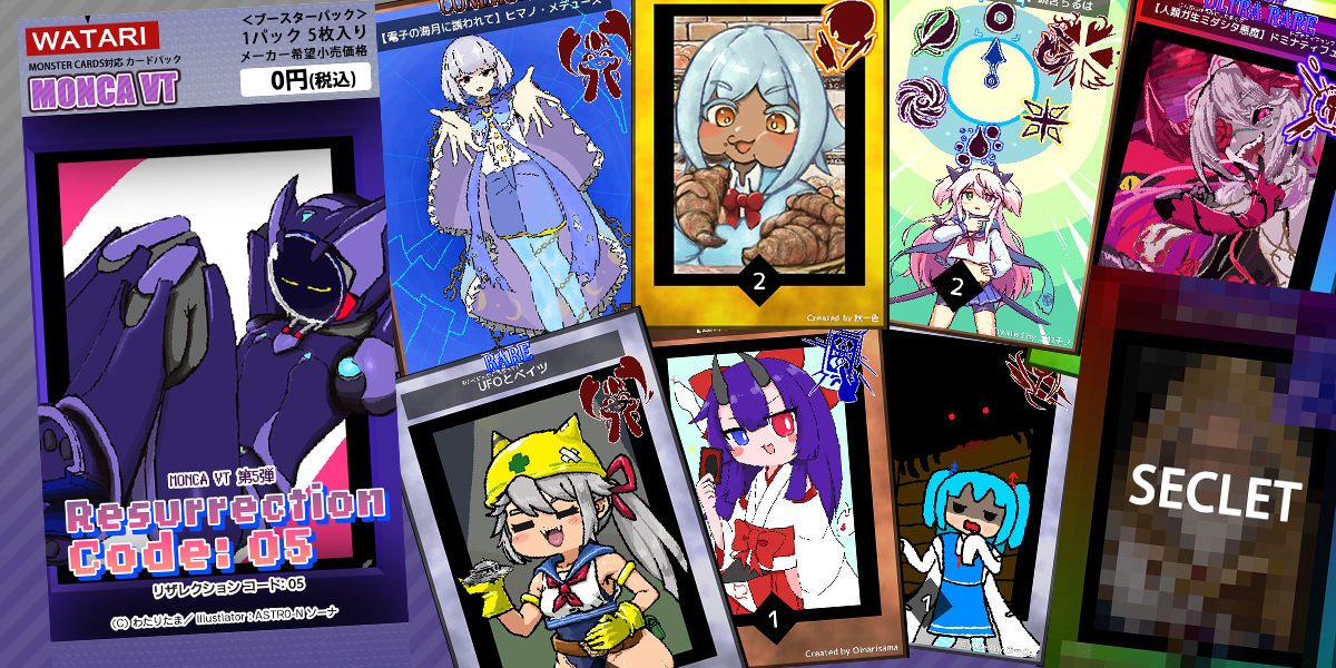 MONSTER CARDSカードパック 「MONCA VT」 2023.11.132026.01.26 モンカVT第4弾SummerEscape-煌めく陽炎たち-MONSTER CARDSカードパック MONCA VTMONCA VT 第5弾 ResurrectionCode:051年ぶりにモンカVTが帰ってきた! 新スキルも含めたカードで一緒に遊ぼう カードパックを引くALL(1-4弾)MONSTER CARDSカードパック MONCA VTMONCA VT 全弾複合パック!MONCA VT第1-4弾! 1年で出た全てのカードを収録!全339種をお楽しみください! カードパックを見る1-3弾MONSTER CARDSカードパック MONCA VTMONCA VT 第2・3・4弾複合パック!MONCA VT第1弾・第2弾・第3弾! 夏・秋・冬のVTuberのカード・全248種をお楽しみください! カードパックを見るモンカVT第4弾SummerEscape-煌めく陽炎たち-MONSTER CARDSカードパック MONCA VTMONCA VT 第4弾 Summer Escape-煌めく陽炎たち-夏休みだ!水着だ!VTuberだ! 推しとの楽しい夏の思い出を手に入れてよう カードパックを引く第3弾MONSTER CARD対応パック MONCA VT第3弾「無秩序な冬」冬には多くのイベントがある…クリスマス・大晦日・正月・バレンタイン…。そんな冬のイベントが一気に押し寄せてきたぞ! カードパックを見る第2弾MONSTER CARD対応パック MONCA VT第2弾「仮装と仮想のホラーナイト」第2弾はハロウィンコスをしたVtuberたちも参戦!魔女・カボチャ以外にもパロディあり!緊縛あり!…本当にハロウィン? カードパックを見る第1弾MONSTER CARDS対応パック MONCA VT第1弾- First Edition –MONSTER CARDSにてVtuberたちのブースターパックが登場! 引いて楽しんで、見て楽しんで、戦って楽しんでいこう! カードパックに移動 ※MONCA VTで遊ぶためにはMONSTER CARDSをSteamからインストールする必要があります。 MONSTER CARDS初心者向け 構築済みデッキでとりあえず遊んでみたい方向け MONCA VTの遊び方がわからない方はこちら 最新弾 カードパック「1-4弾 全弾複合カードパック」 新弾 MONCA VT 第1-4弾複合パック MONCA VT NEWS -最新情報- 1/25(日)モンカVT 第5弾-Resurrection CODE:05-を公開! 2026.01.26 MONSTER CARDS(GasaiGames制作) 11/1(土)よりモンカVT第5弾の募集開始(12/21締め切り) 2025.10.31 MONSTER CARDS(GasaiGames制作) モンカVT1-4弾公開と記念配信 2024.08.31 MONSTER CARDS(GasaiGames制作) カードパックリスト MONCA VT 第5弾「ResurrectionCode:05」 (カードリスト) 新弾 MONCA VT 第1-4弾複合パック MONCA VT 第2・3・4弾複合パック MONCA VT 第4弾「SummerEscape-煌めく陽炎たち」 (カードリスト) MONCA VT 第3弾「無秩序な冬」 全カードパックはこちら